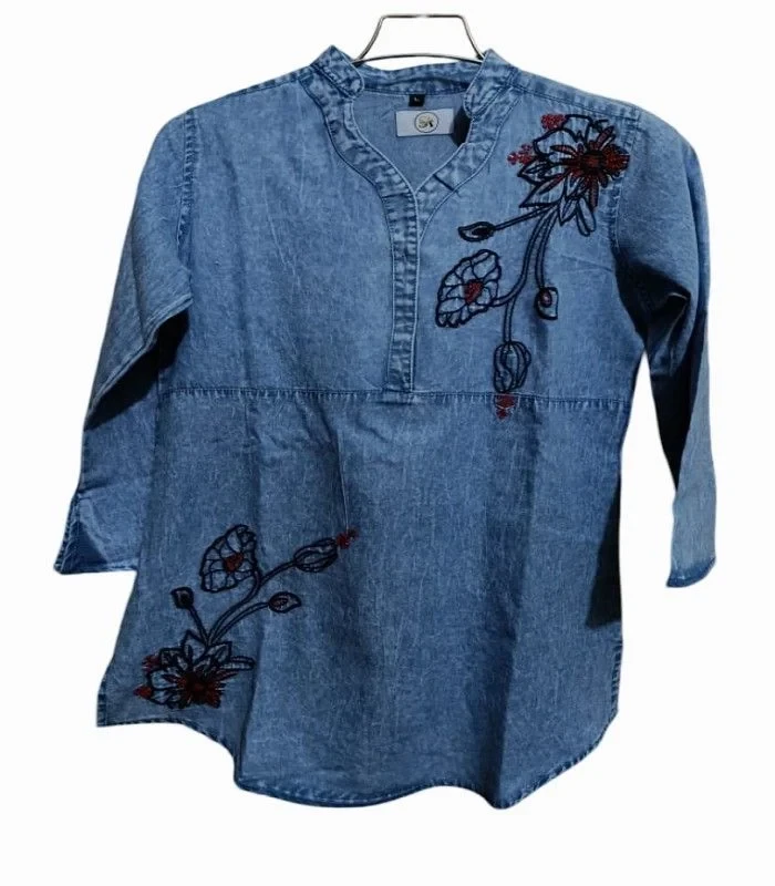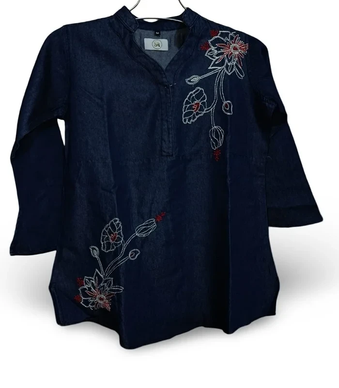 ITEM: EMBRODEDED DENIMFabric: 185 GSM Denim Poly CottonColors: Sky Light/ Sky Mid/ Dark NavySize: S, M, L, XL, XXLFeatures: V-Neck Line, Collar, Curved Hemline, Floral Embroidery