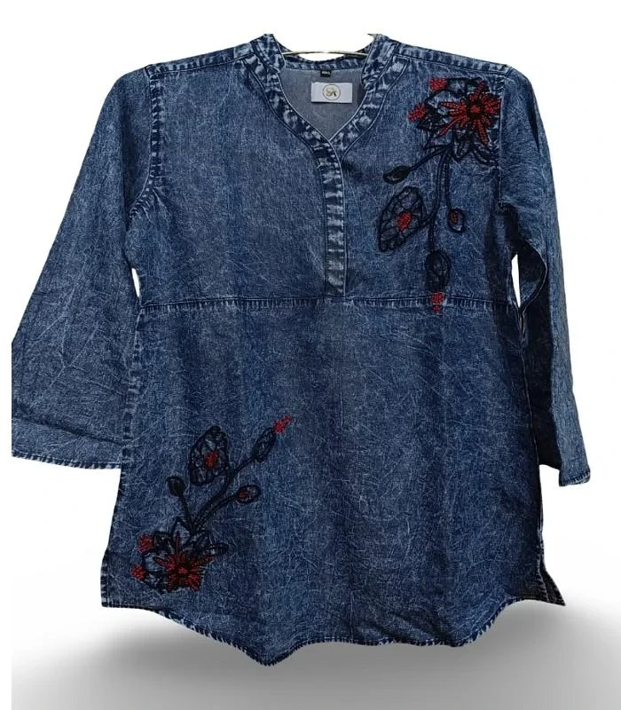 ITEM: EMBRODEDED DENIMFabric: 185 GSM Denim Poly CottonColors: Sky Light/ Sky Mid/ Dark NavySize: S, M, L, XL, XXLFeatures: V-Neck Line, Collar, Curved Hemline, Floral Embroidery